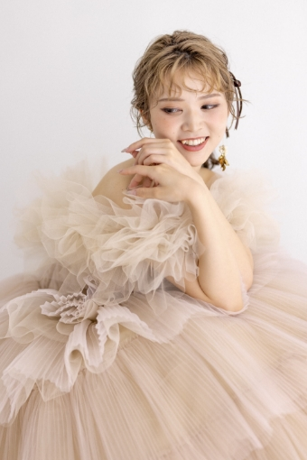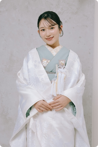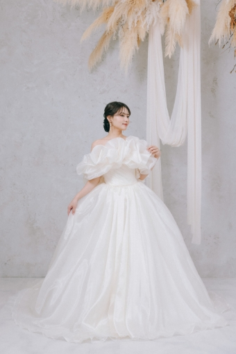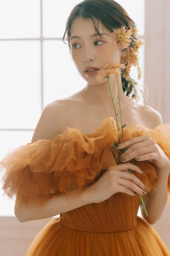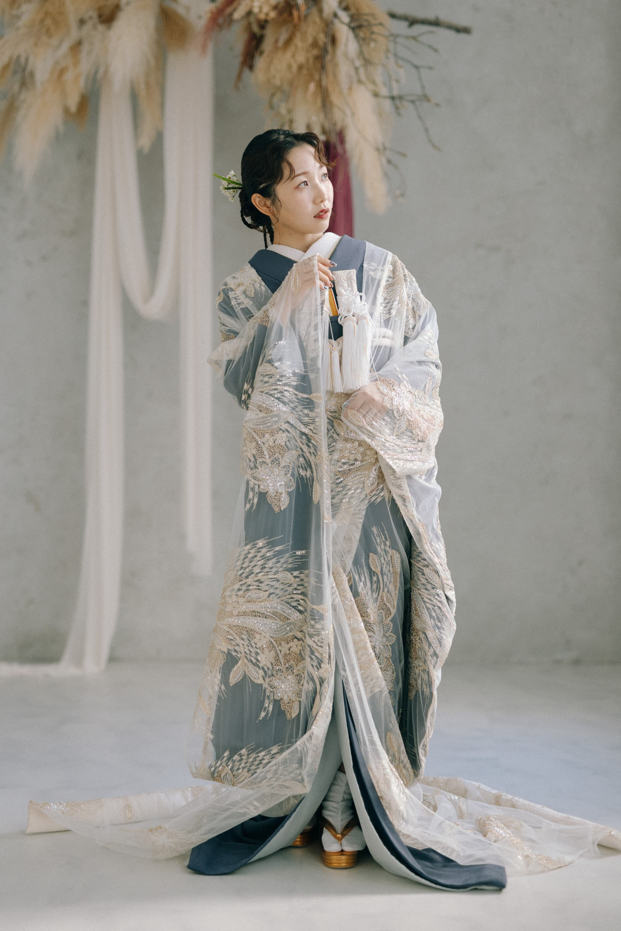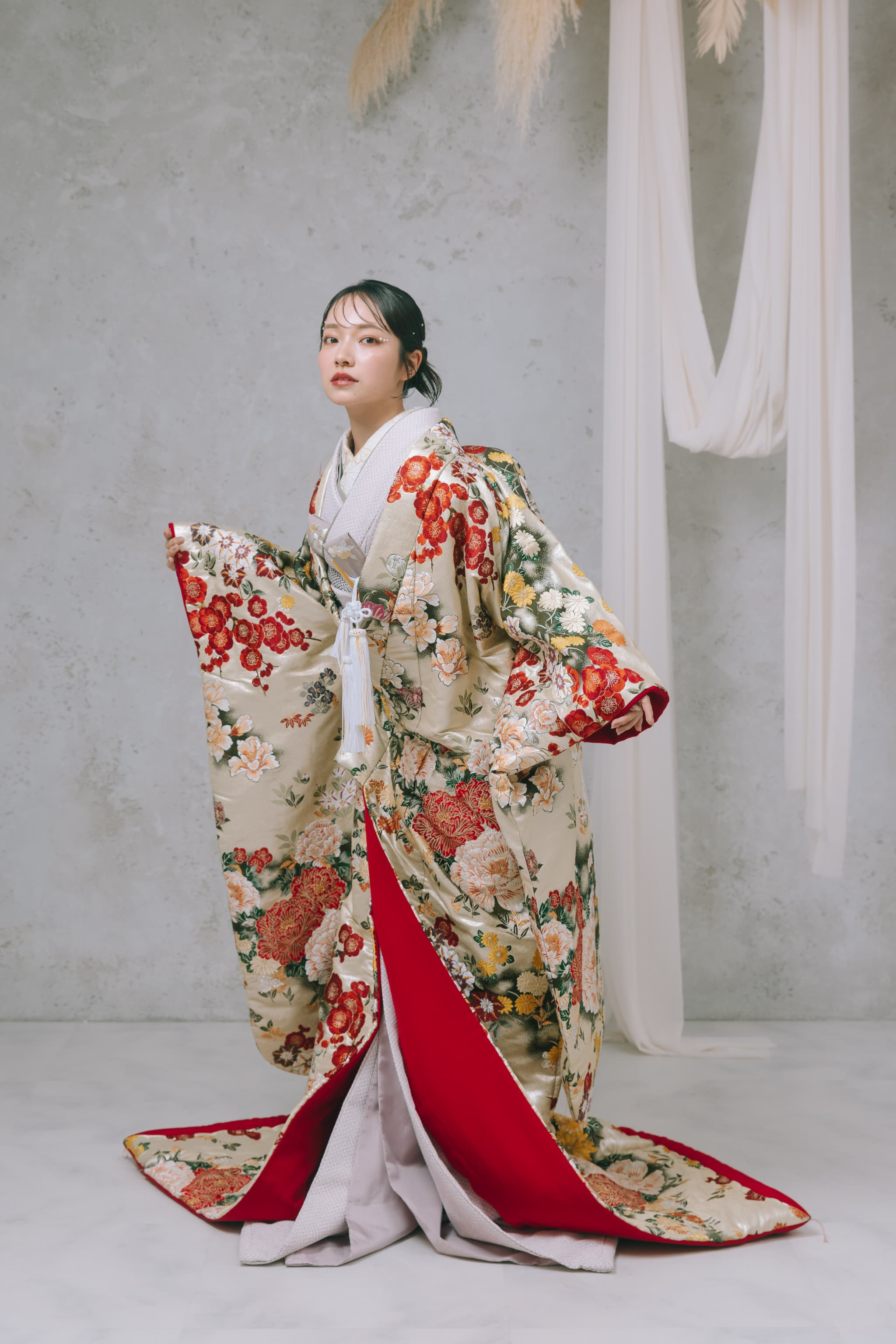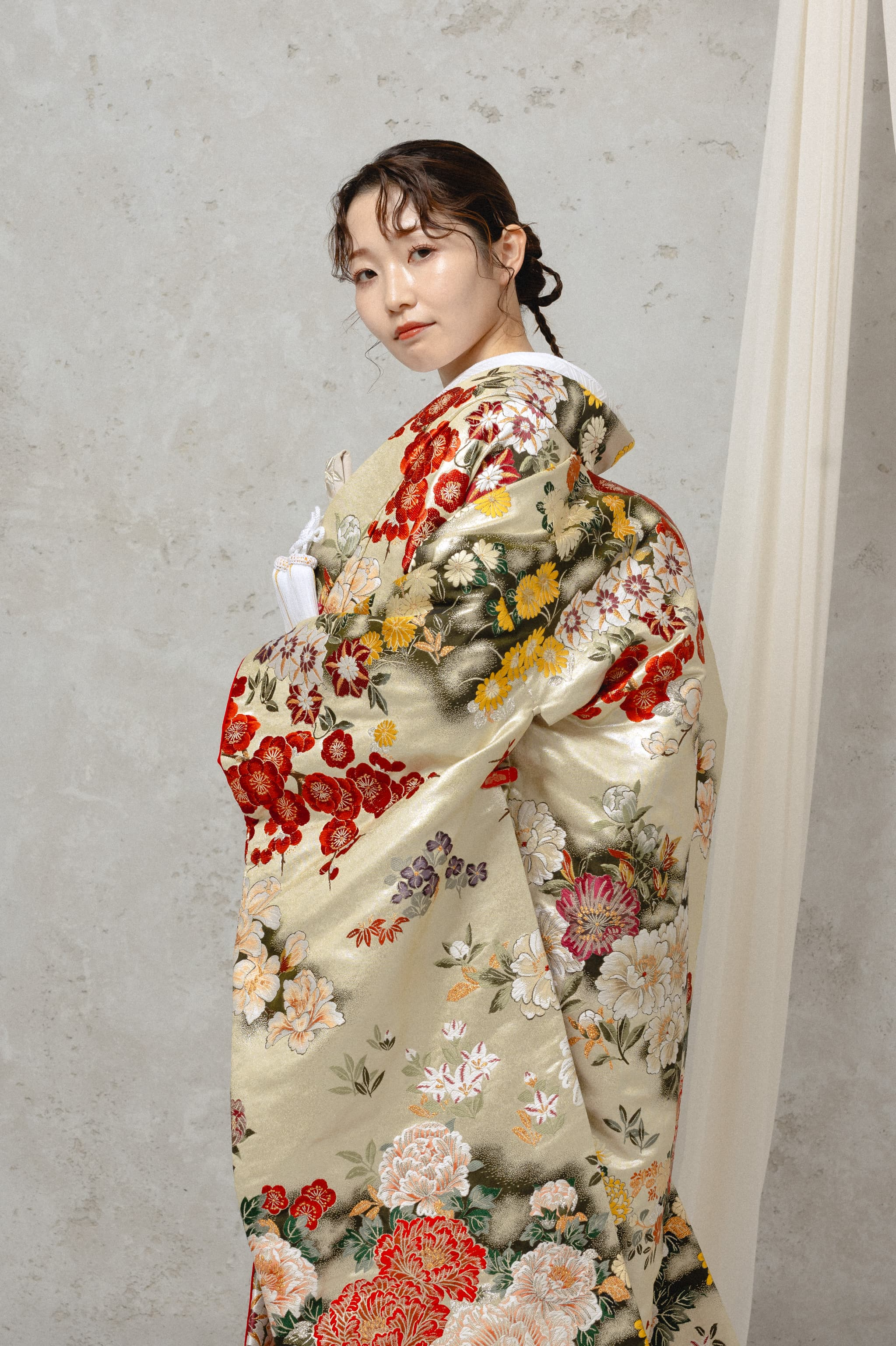 花嫁の象徴とされるウェディングドレスや和装の打掛。肌の色や体型、また、なりたいイメージに合わせて衣装選びをサポートします。