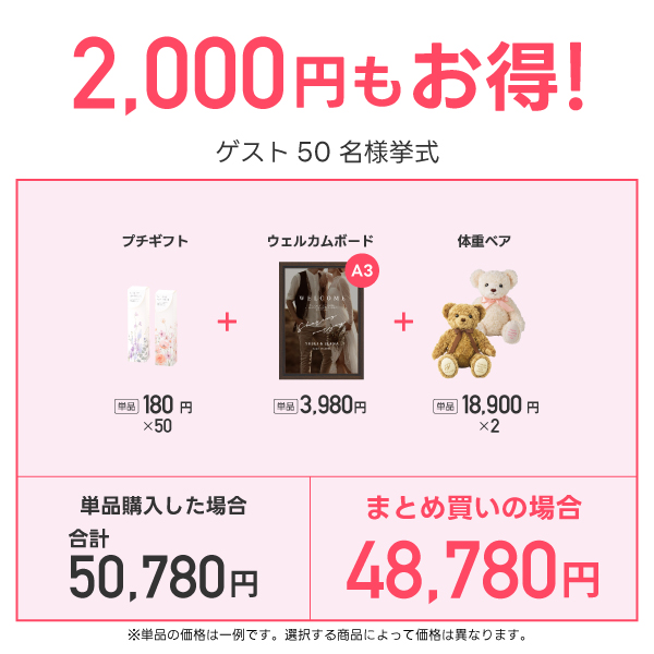 ゲスト50名分のプチギフト・ウェルカムボード・両親プレゼント【ウェイトベア】をまとめて購入で何と2,000円OFF!!