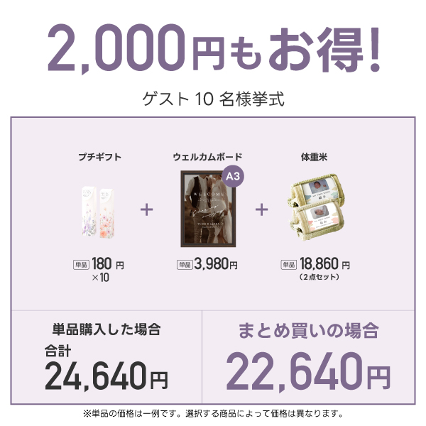 ゲスト10名分のプチギフト・ウェルカムボード・両親プレゼント【体重米】をまとめて購入で何と2,000円OFF!!