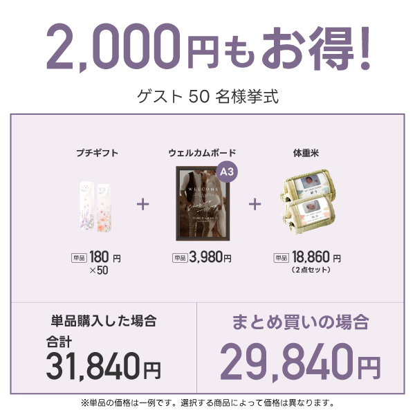 ゲスト50名分のプチギフト・ウェルカムボード・両親プレゼント【体重米】をまとめて購入で何と2,000円OFF!!