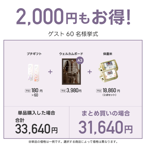 ゲスト60名分のプチギフト・ウェルカムボード・両親プレゼント【体重米】をまとめて購入で何と2,000円OFF!!