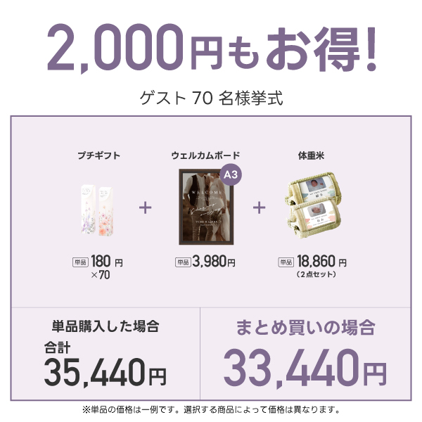 ゲスト70名分のプチギフト・ウェルカムボード・両親プレゼント【体重米】をまとめて購入で何と2,000円OFF!!