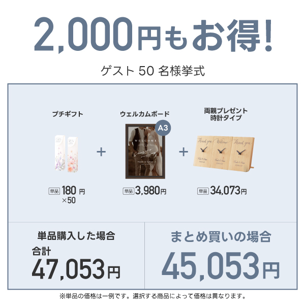 ゲスト50名分のプチギフト・ウェルカムボード・両親プレゼント【時計タイプ】をまとめて購入で何と2,000円OFF!!