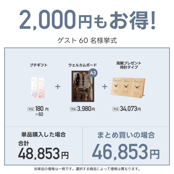 ゲスト60名分のプチギフト・ウェルカムボード・両親プレゼント【時計タイプ】をまとめて購入で何と2,000円OFF!!