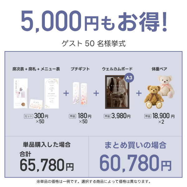 【7%OFF】超得!まとめ買いセット 50名様分 Gコース (席次表A4サイズ・席札・メニュー表・プチギフト・ウェルカムボード・両親プレゼント【ウェイトベア】)|超得!まとめ買いセットならPIARY(ピアリー)
