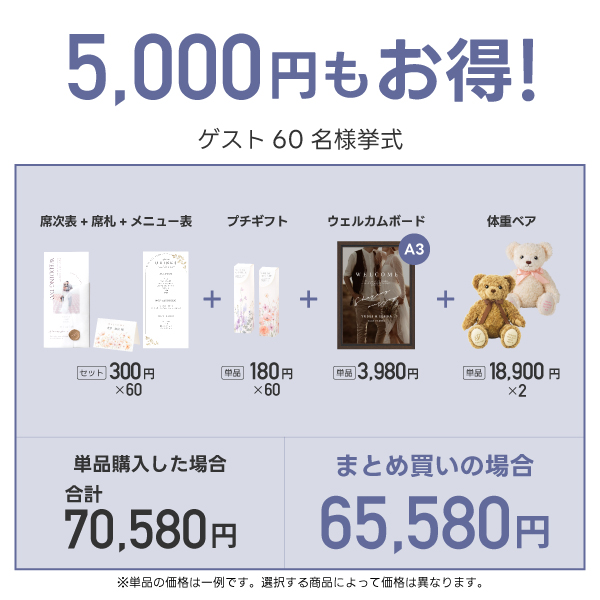【7%OFF】超得!まとめ買いセット 60名様分 Gコース (席次表A4サイズ・席札・メニュー表・プチギフト・ウェルカムボード・両親プレゼント【ウェイトベア】)|超得!まとめ買いセットならPIARY(ピアリー)