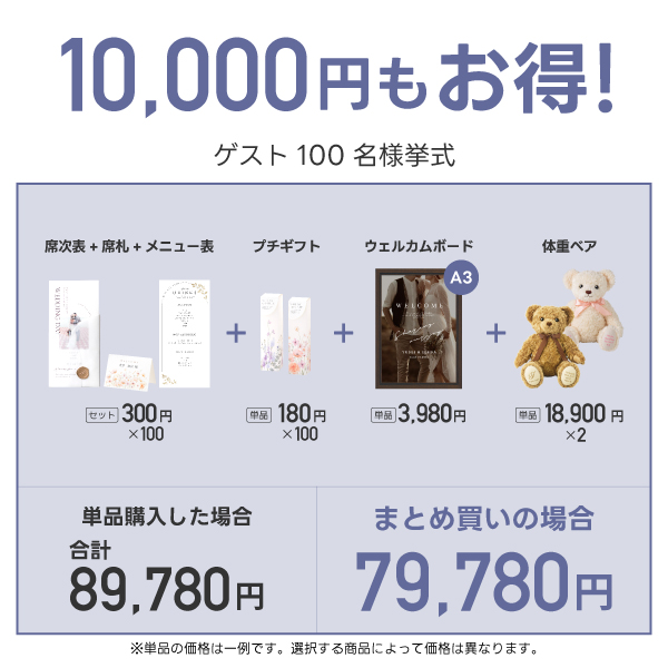 【11%OFF】超得!まとめ買いセット 100名様分 Gコース (席次表A4サイズ・席札・メニュー表・プチギフト・ウェルカムボード・両親プレゼント【ウェイトベア】)|超得!まとめ買いセットならPIARY(ピアリー)