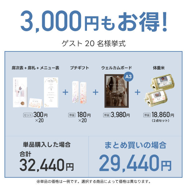 ゲスト20名分の席次表A4サイズ・席札・メニュー表・プチギフト・ウェルカムボード・両親プレゼント【体重米】をまとめて購入で何と3,000円OFF!!