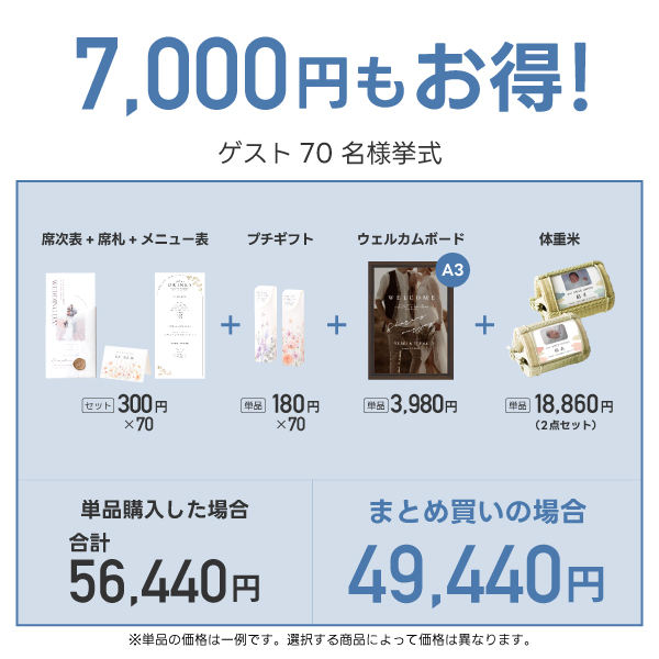 【12%OFF】超得!まとめ買いセット 70名様分 Hコース (席次表A4サイズ・席札・メニュー表・プチギフト・ウェルカムボード・両親プレゼント【体重米】)|超得!まとめ買いセットならPIARY(ピアリー)