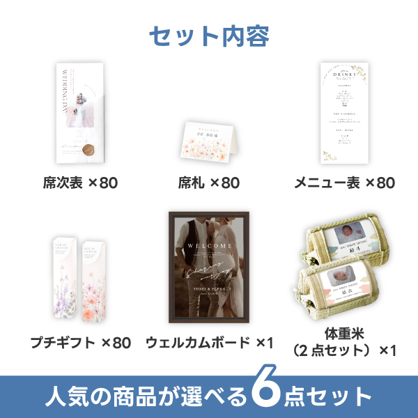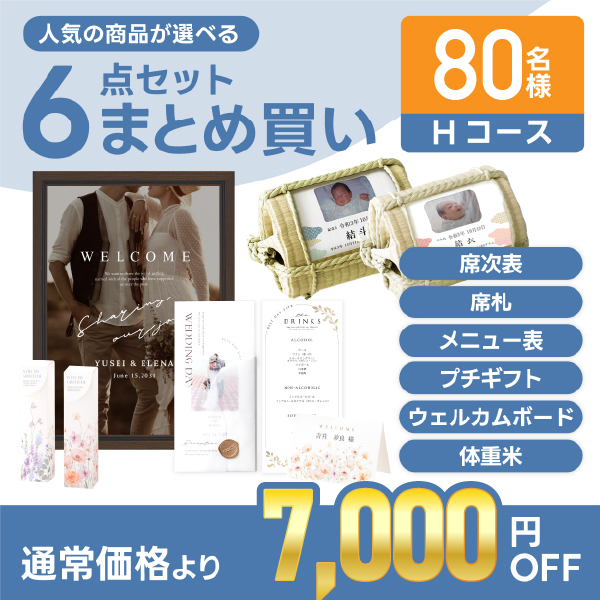 【11%OFF】超得!まとめ買いセット 80名様分 Hコース (席次表A4サイズ・席札・メニュー表・プチギフト・ウェルカムボード・両親プレゼント【体重米】)|超得!まとめ買いセットならPIARY(ピアリー)
