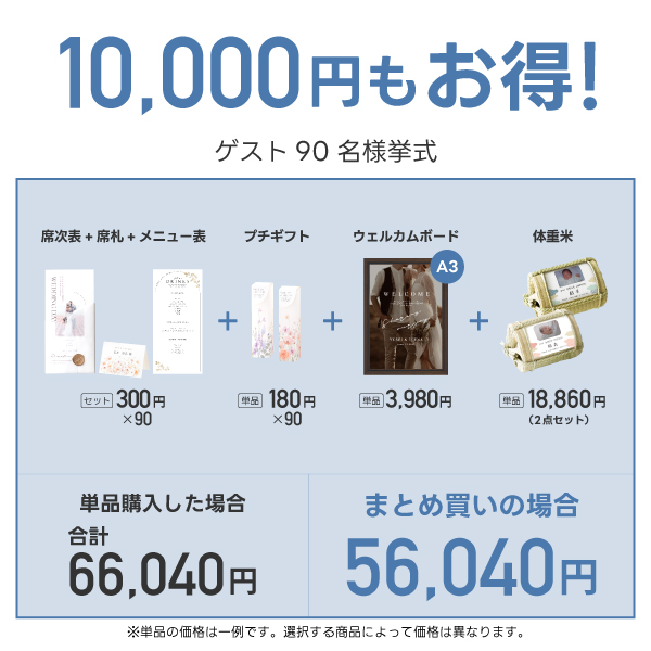 ゲスト90名分の席次表A4サイズ・席札・メニュー表・プチギフト・ウェルカムボード・両親プレゼント【体重米】をまとめて購入で何と10,000円OFF!!