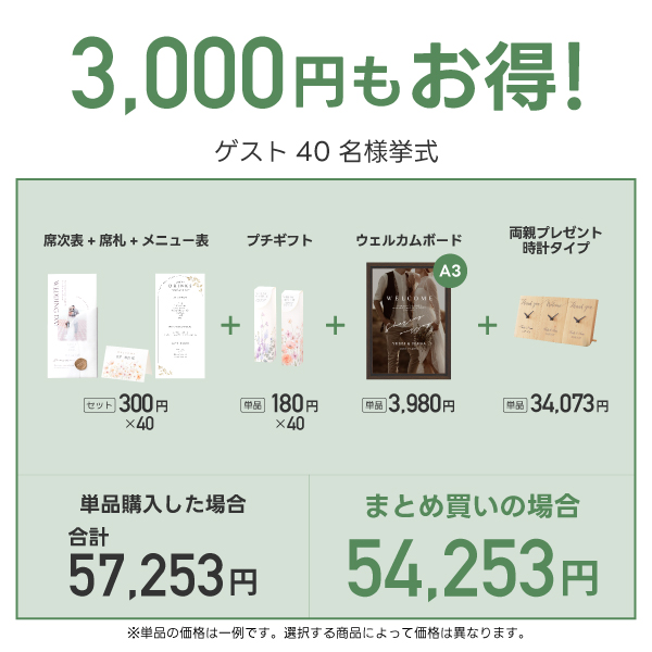 【5%OFF】超得!まとめ買いセット 40名様分 Iコース (席次表A4サイズ・席札・メニュー表・プチギフト・ウェルカムボード・両親プレゼント【時計タイプ】)|超得!まとめ買いセットならPIARY(ピアリー)