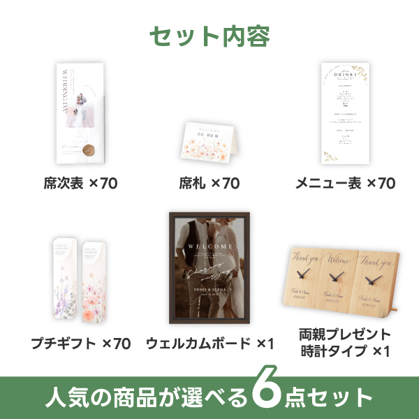 【9%OFF】超得!まとめ買いセット 70名様分 Iコース (席次表A4サイズ・席札・メニュー表・プチギフト・ウェルカムボード・両親プレゼント【時計タイプ】)|超得!まとめ買いセットならPIARY(ピアリー)