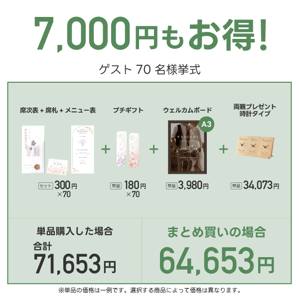 ゲスト70名分の席次表A4サイズ・席札・メニュー表・プチギフト・ウェルカムボード・両親プレゼント【時計タイプ】をまとめて購入で何と7,000円OFF!!