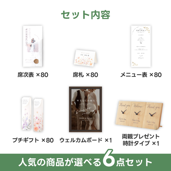 【9%OFF】超得!まとめ買いセット 80名様分 Iコース (席次表A4サイズ・席札・メニュー表・プチギフト・ウェルカムボード・両親プレゼント【時計タイプ】)|超得!まとめ買いセットならPIARY(ピアリー)