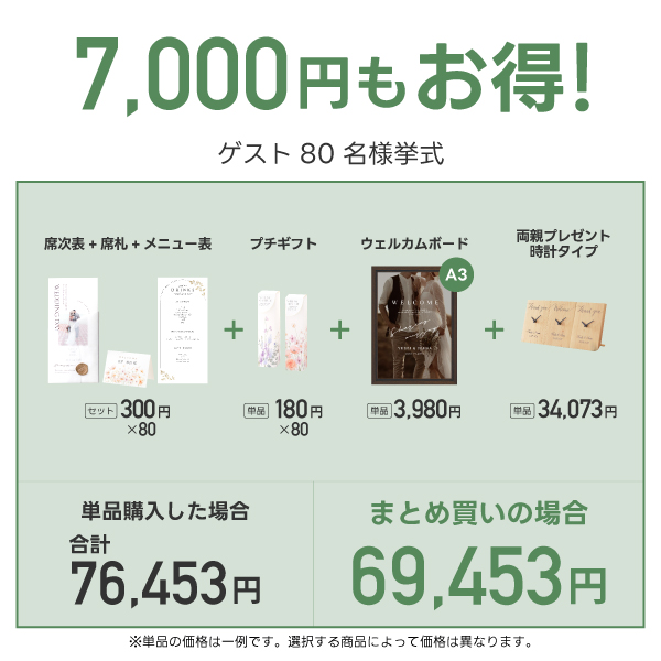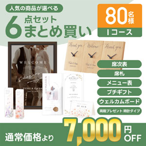 ゲスト80名分の席次表A4サイズ・席札・メニュー表・プチギフト・ウェルカムボード・両親プレゼント【時計タイプ】をまとめて購入で何と7,000円OFF!!