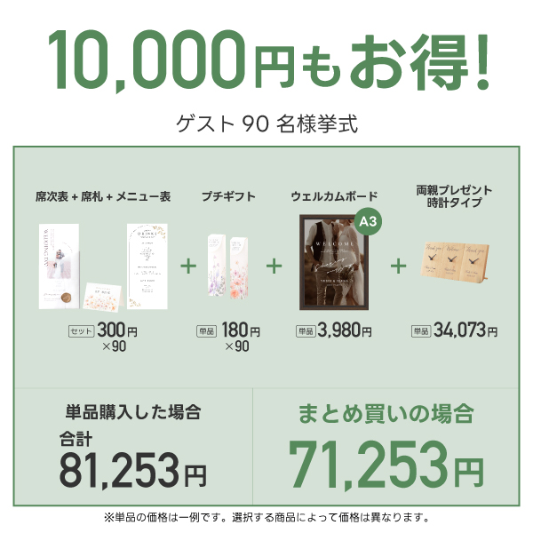 ゲスト90名分の席次表A4サイズ・席札・メニュー表・プチギフト・ウェルカムボード・両親プレゼント【時計タイプ】をまとめて購入で何と10,000円OFF!!