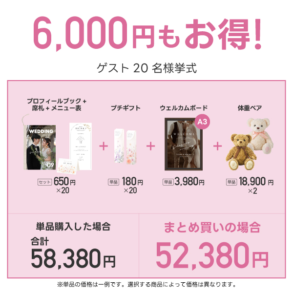 ゲスト20名分のプロフィールブック【席次表付き8ページ】・席札・メニュー表・プチギフト・ウェルカムボード・両親プレゼント【ウェイトベア】をまとめて購入で何と6,000円OFF!!