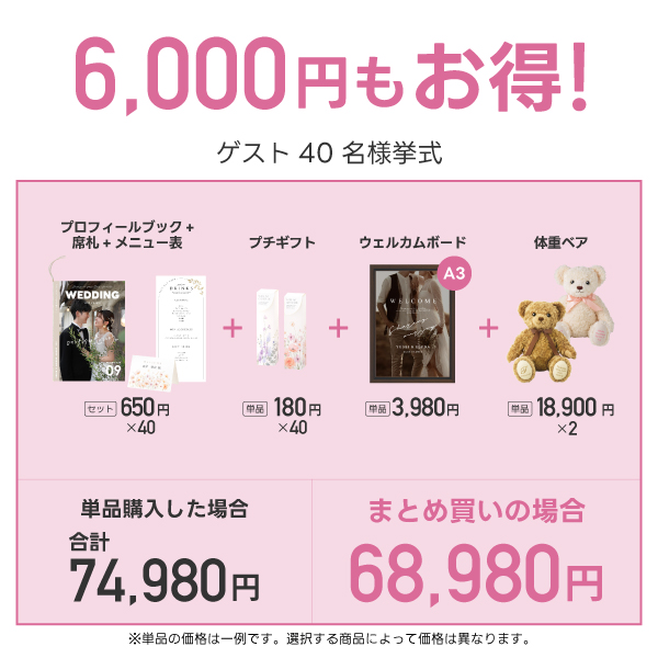 ゲスト40名分のプロフィールブック【席次表付き8ページ】・席札・メニュー表・プチギフト・ウェルカムボード・両親プレゼント【ウェイトベア】をまとめて購入で何と6,000円OFF!!