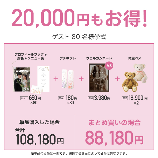 ゲスト80名分のプロフィールブック【席次表付き8ページ】・席札・メニュー表・プチギフト・ウェルカムボード・両親プレゼント【ウェイトベア】をまとめて購入で何と20,000円OFF!!