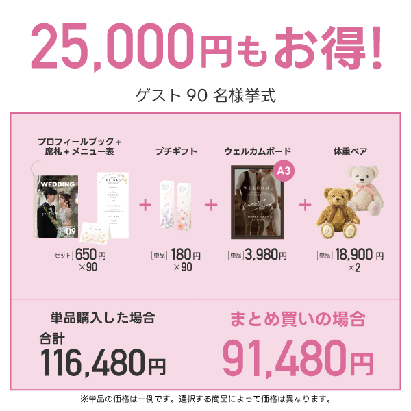 ゲスト90名分のプロフィールブック【席次表付き8ページ】・席札・メニュー表・プチギフト・ウェルカムボード・両親プレゼント【ウェイトベア】をまとめて購入で何と25,000円OFF!!