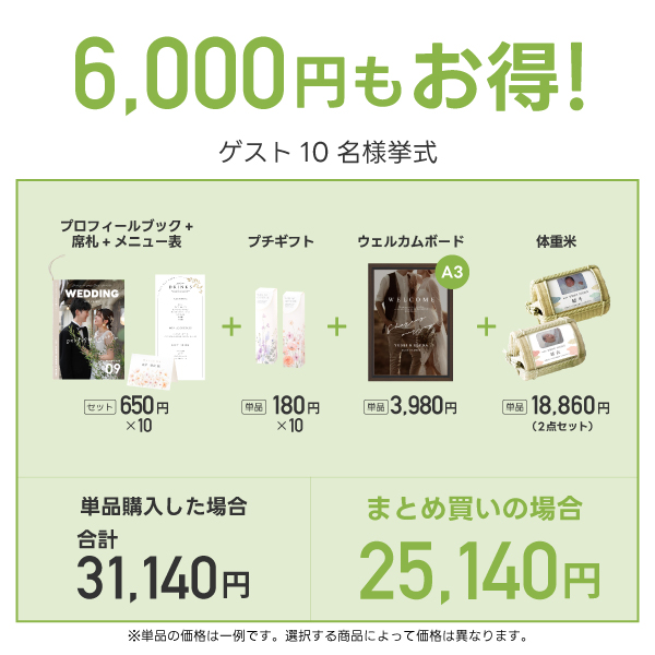 ゲスト10名分のプロフィールブック【席次表付き8ページ】・席札・メニュー表・プチギフト・ウェルカムボード・両親プレゼント【体重米】をまとめて購入で何と6,000円OFF!!
