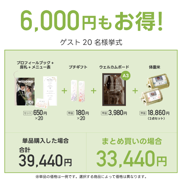 ゲスト20名分のプロフィールブック【席次表付き8ページ】・席札・メニュー表・プチギフト・ウェルカムボード・両親プレゼント【体重米】をまとめて購入で何と6,000円OFF!!