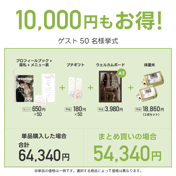 ゲスト50名分のプロフィールブック【席次表付き8ページ】・席札・メニュー表・プチギフト・ウェルカムボード・両親プレゼント【体重米】をまとめて購入で何と10,000円OFF!!