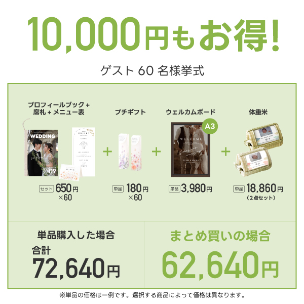ゲスト60名分のプロフィールブック【席次表付き8ページ】・席札・メニュー表・プチギフト・ウェルカムボード・両親プレゼント【体重米】をまとめて購入で何と10,000円OFF!!