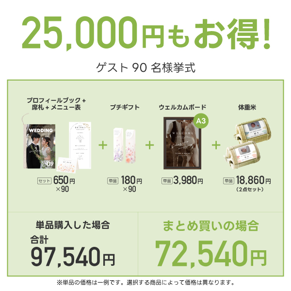 ゲスト90名分のプロフィールブック【席次表付き8ページ】・席札・メニュー表・プチギフト・ウェルカムボード・両親プレゼント【体重米】をまとめて購入で何と25,000円OFF!!