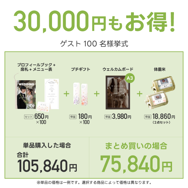 ゲスト100名分のプロフィールブック【席次表付き8ページ】・席札・メニュー表・プチギフト・ウェルカムボード・両親プレゼント【体重米】をまとめて購入で何と30,000円OFF!!