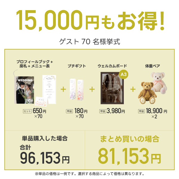 【15%OFF】超得!まとめ買いセット 70名様分 Uコース (プロフィールブック【席次表付き8ページ】・席札・メニュー表・プチギフト・ウェルカムボード・両親プレゼント【時計タイプ】)|超得!まとめ買いセットならPIARY(ピアリー)