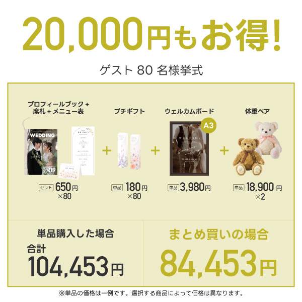 | プロフィールブック(席次表付き8ページ) └ 選べる商品一覧はこちら > | 80名様分 |
