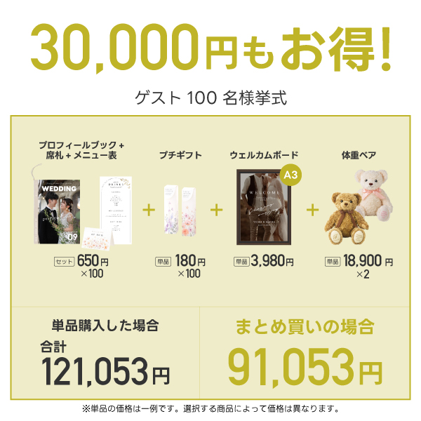 ゲスト100名分のプロフィールブック【席次表付き8ページ】・席札・メニュー表・プチギフト・ウェルカムボード・両親プレゼント【時計タイプ】をまとめて購入で何と30,000円OFF!!