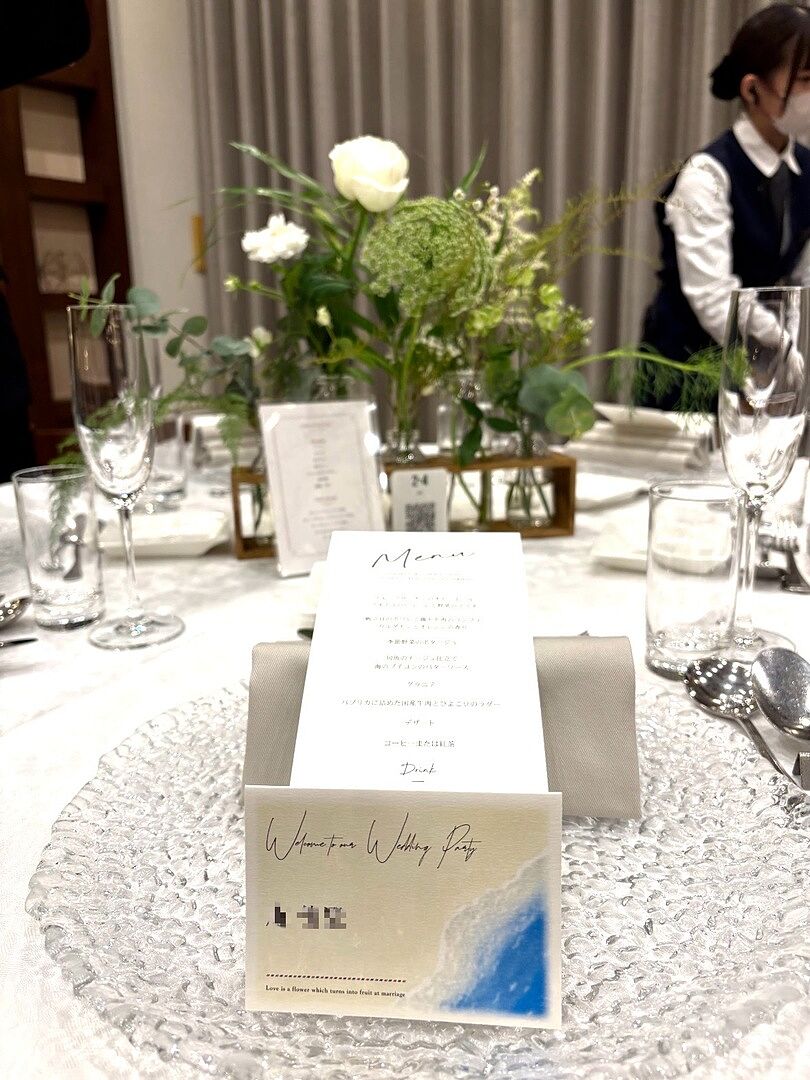 もともとメニュー表は作らないつもりでした ただ、無料なら失敗してもいいから やってみようということでお願いしました! 届いてみると 無料とは思えない仕上がりに感動しました🥹 お料理にこだわった結婚式なので、 メニュー表をお持ち帰りいただいて 帰宅後 ゲストの皆さんがメニュー表をみておうちで結婚式のお料理のお話を してもらえると嬉しいなと思っています😊