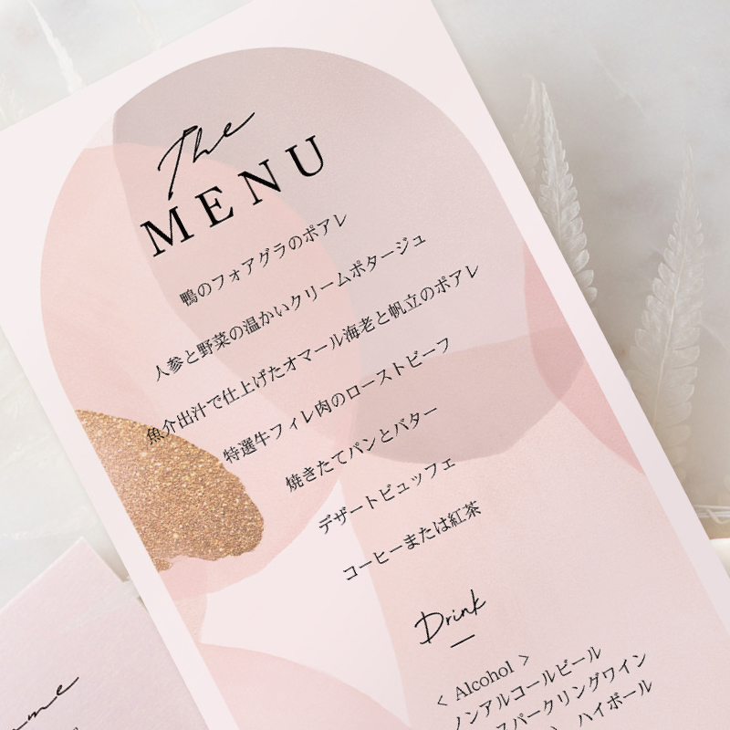 席次などはピンクのチューリップ柄にしたので、色を統一しようと思いこちらのピンクのメニュー表にしました。作りたい雰囲気にも合い、紙自体もしっかりした作りなのでとても満足です。