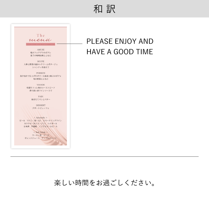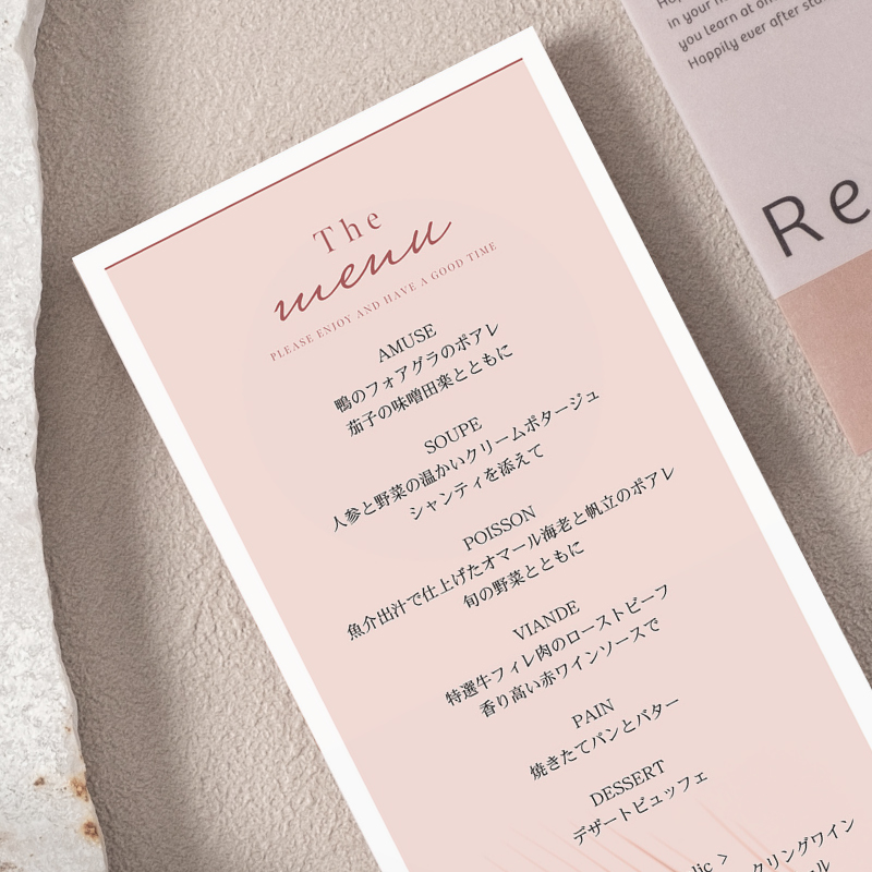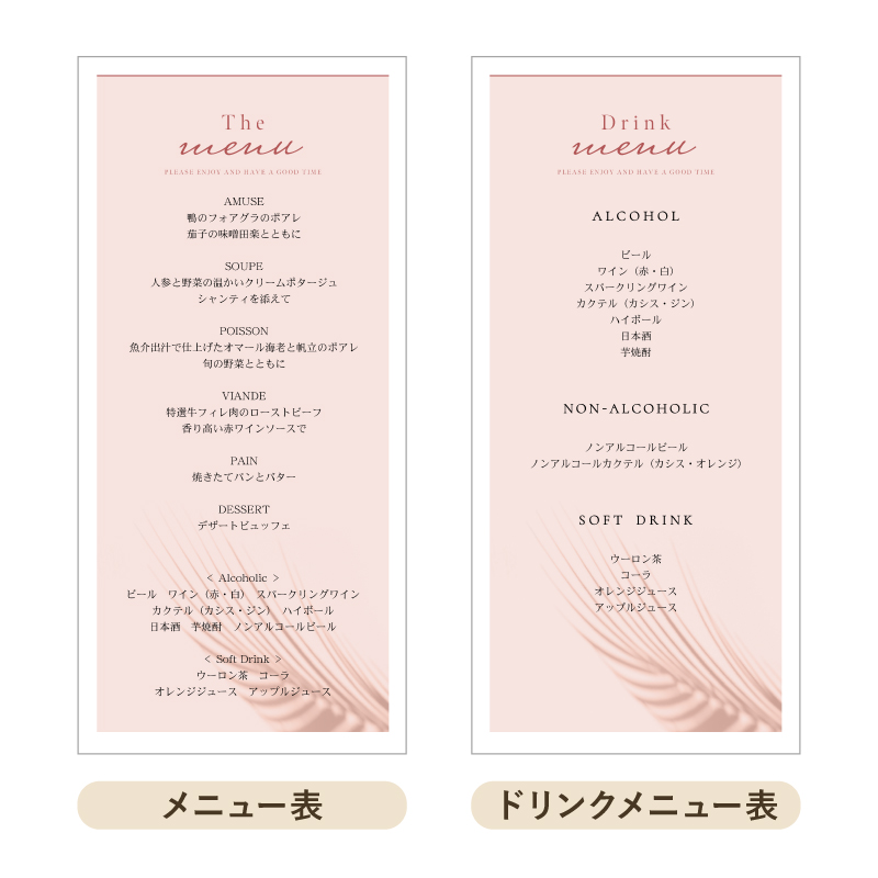 落ち着きのあるピンクベースのカラーに草花のシルエットをプラスした、大人ナチュラルなデザインのメニュー表。光が当たるからこそできるシルエットは、特別な日をこれから迎える主役のおふたりのよう。ナチュラルウェディングにぴったりのアイテムです。