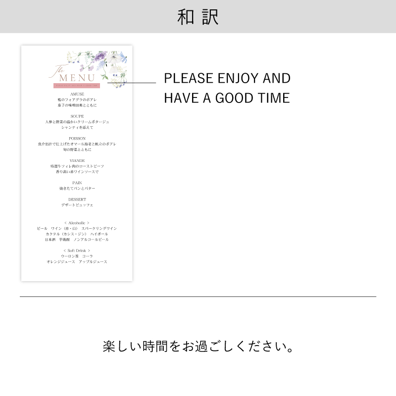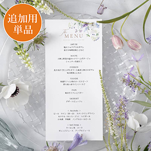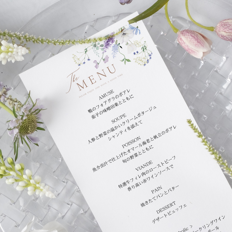 花束のような美しさが満開!今どき花嫁に大人気のぴょんぴょんブーケをモチーフにしたメニュー表。アネモネなどブルーの花々がテーブルレイアウトを際立たせてくれます。ナチュラルウェディングはもちろん、エレガントウェディングや高級感のあるホテルウェディングなど、どんなテーマにも合わせやすい1枚です。