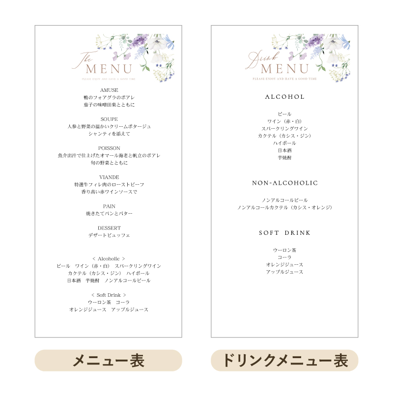 お料理とドリンクメニューを両方載せたり、片方だけを載せたりお好みのレイアウトのメニュー表がカンタンに作成できます。