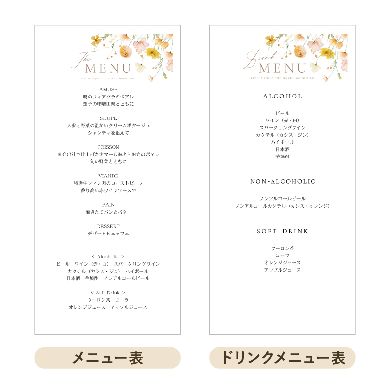 席次表の購入でメニュー表と席札が付いてくるプランでとてもお得だったことや、 小さな箱でコンパクトに配送されてきた事がとても良かった。家に式の準備の物が 溢れかえってる今とてもありがたい。もちろん仕上がりもとても綺麗。