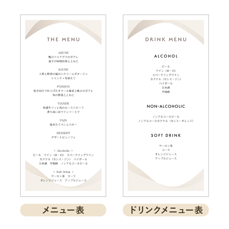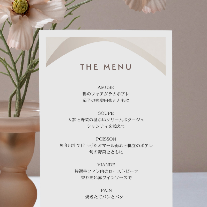 みずみずしいベージュのウォーターカラーが魅了するメニュー表“ミスティ” ウェーブラインは艶っぽさと自然な立体感をもたらし、まるでコスメのような大人の色気を感じる。透明感のある上品なスタイルの1枚だからこそ、ハイレベルのウェディングに。