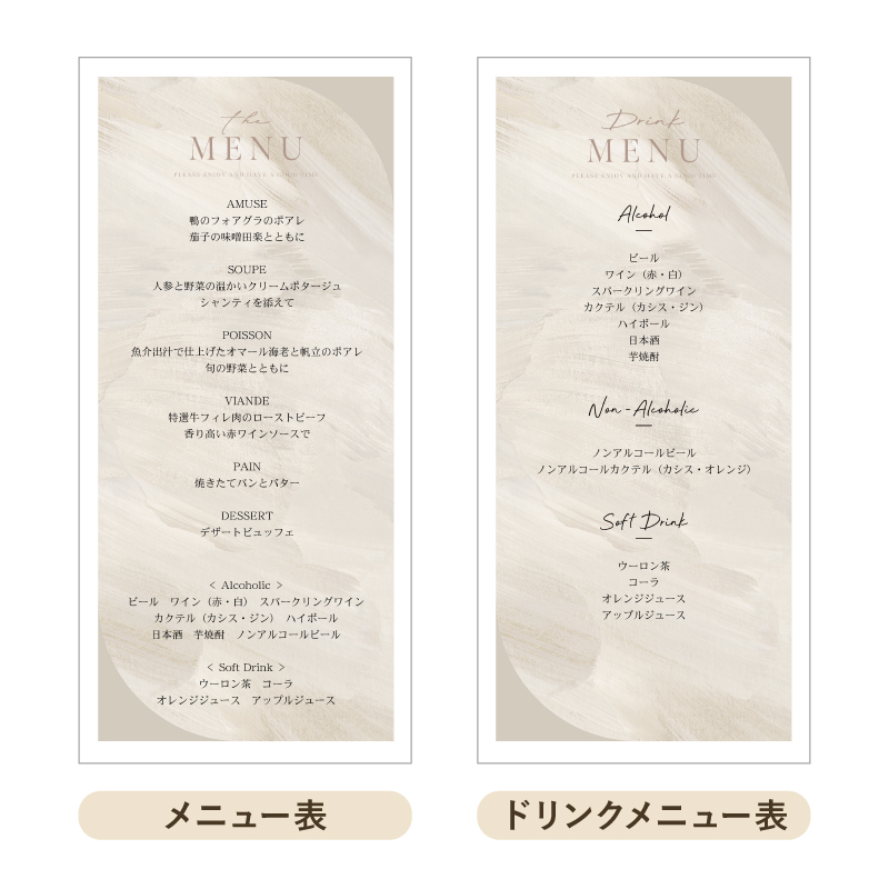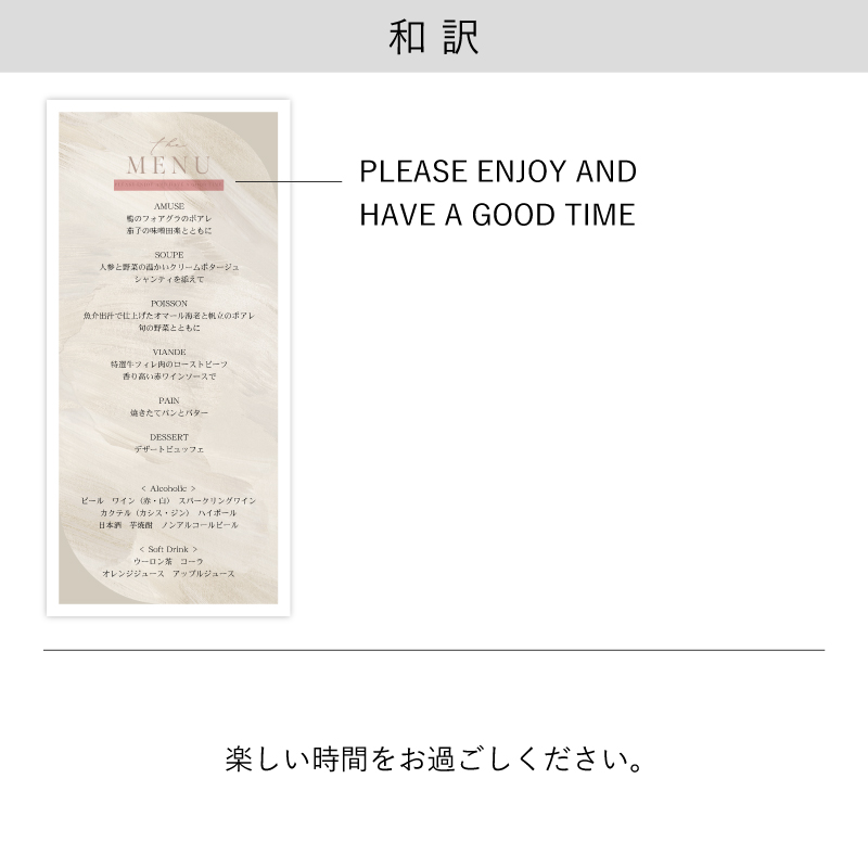 まず豊富なデザインから選ぶことのワクワク感、字体を選べるのでデザインに合わせて自分だけのメニュー表が作れる楽しさ、納品も早くて仕上がりも期待以上でした。全てに満足です^ ^