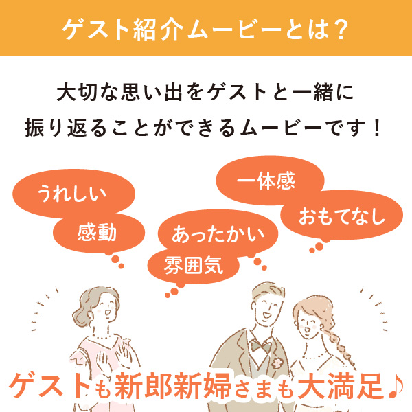 大切なゲストをサプライズムービーでご紹介!ゲストごとにコメントを入れて、大切な日にかけつけてくれたゲストへ感謝の気持ちを贈りませんか♪ポップなテンポにのせて、新郎新婦だけでなく、ゲストを一緒に巻き込むことで一体感が生まれて会場がきっと盛り上がるはず!