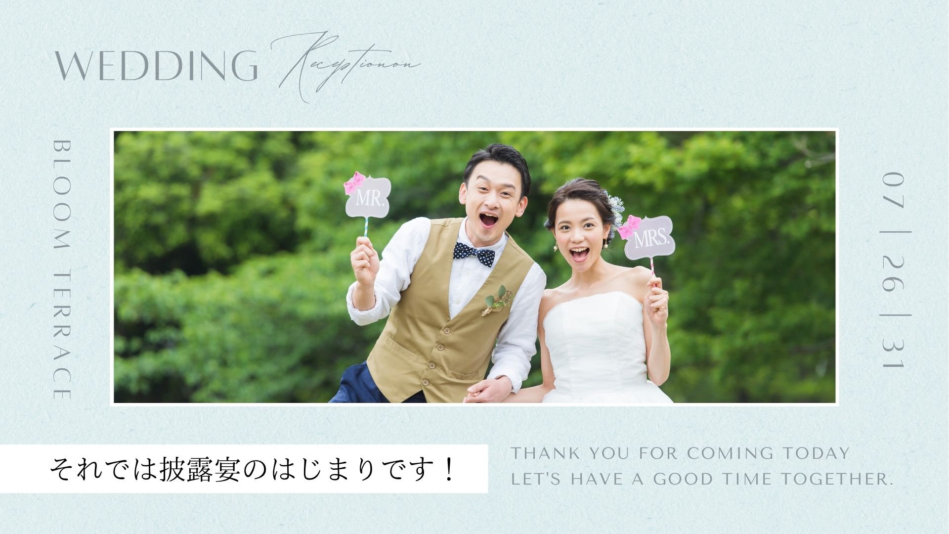 フォトフレームを連想するシンプルなデザインが、優しくおふたりを包み込んでいるかのように”最高の瞬間”を際立たせてくれるオープニングムービー。ナチュラルさを感じるブルーのくすみカラーに、スタイリッシュな文字をプラスすること大人な爽やかさを演出。今日という最高にフォトジェニックな日を、大切なゲストと迎えられることが何よりの幸せ。笑って泣いて、思いきり楽しんでいってください!とっておきの一日が始まります!
