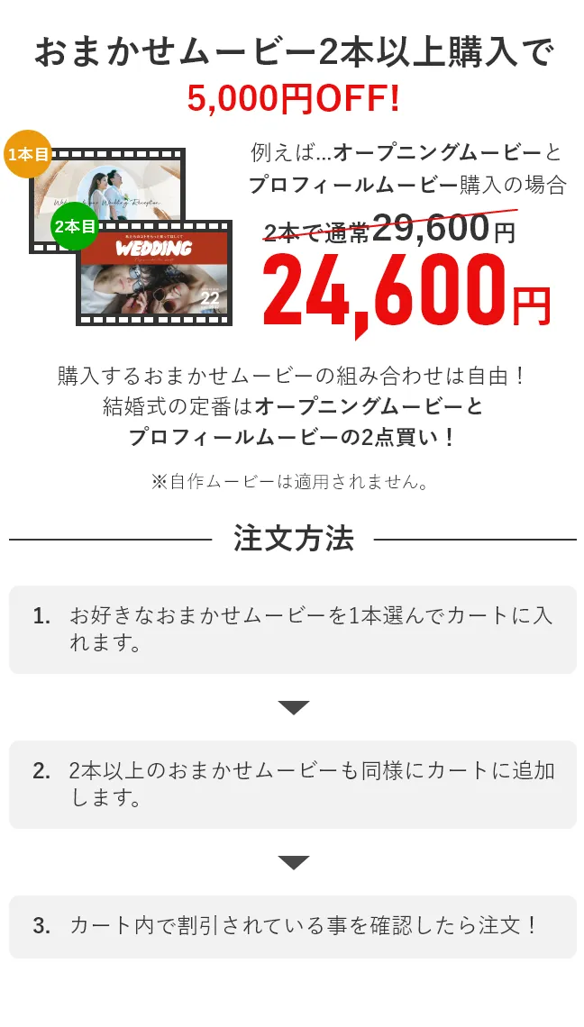 ※市販楽曲の使用は著作権申請料5,400円(/1曲)となります。ムービー購入後、myムービー内で決済となります。