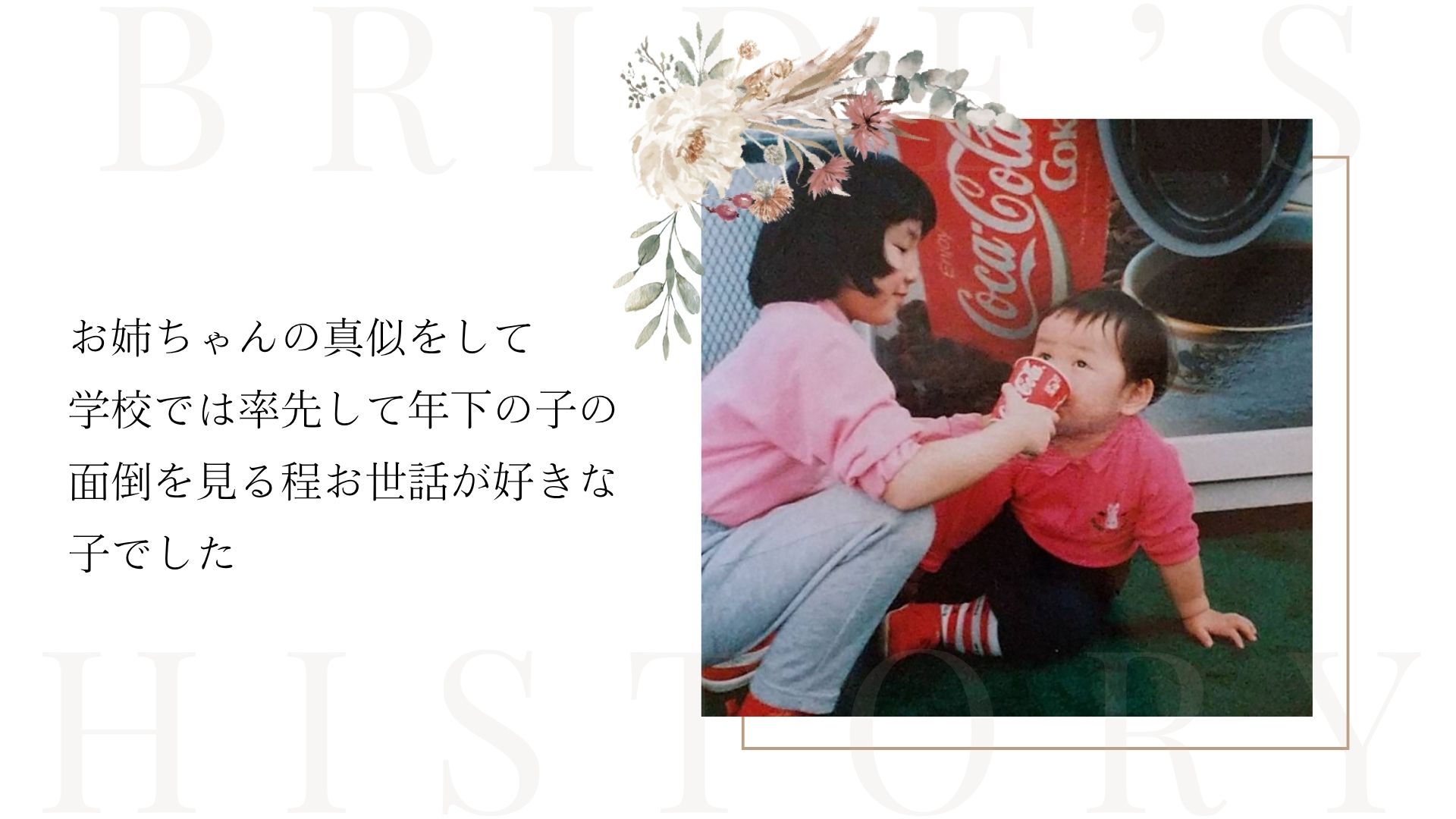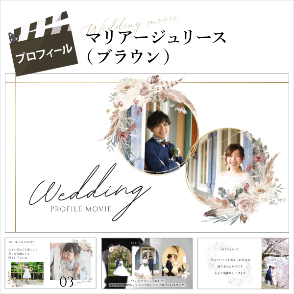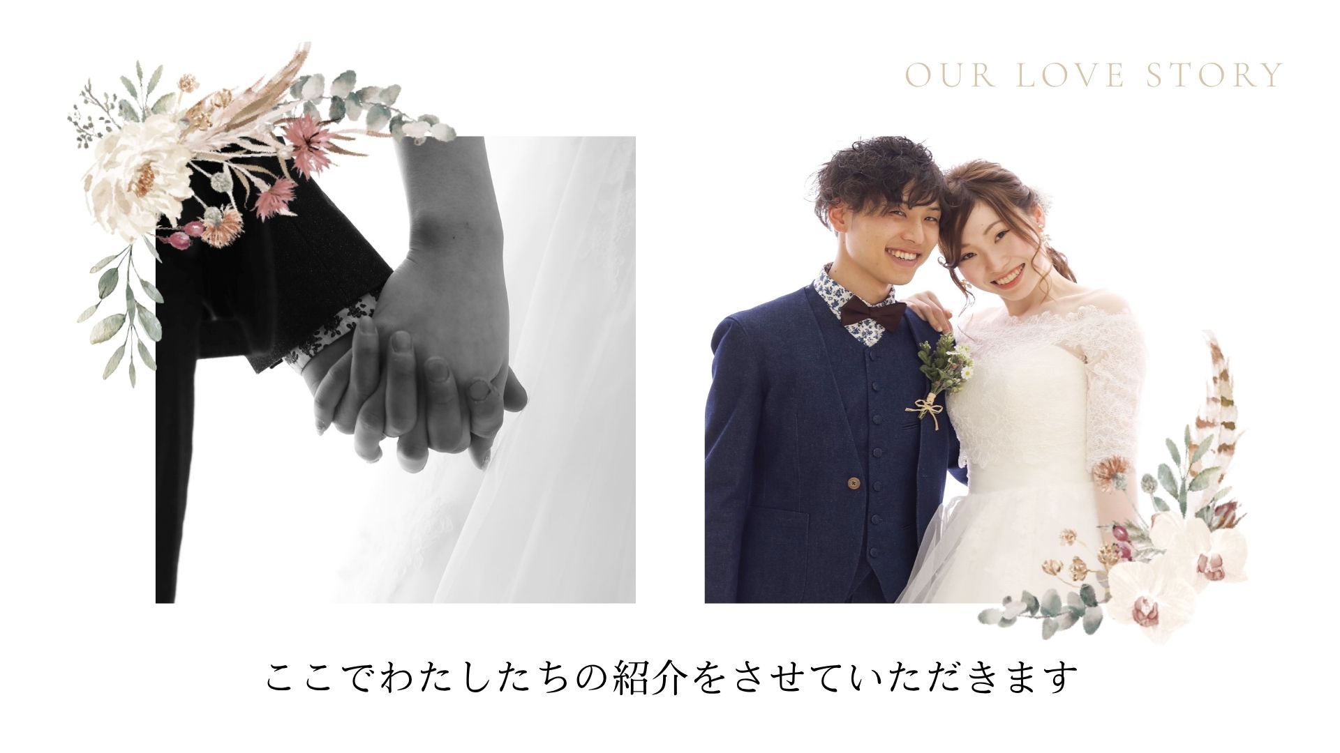 落ち着いたなじみやすいくすみカラーと重ねたアーチ型がシンプルなのに甘さ控えめな大人っぽさを演出。全体を通して柔らかいテイストなので、中座中でも会場をあたたかな雰囲気にしてくれます。小さな出会いから、お二人のラブストーリーまで描くプロフィールムービーは、ウェディング演出にぴったり。これまで支えてくださったすべての方へ、心より感謝を込めて。これからも笑顔あふれる日々を大切に育んでいきます。
