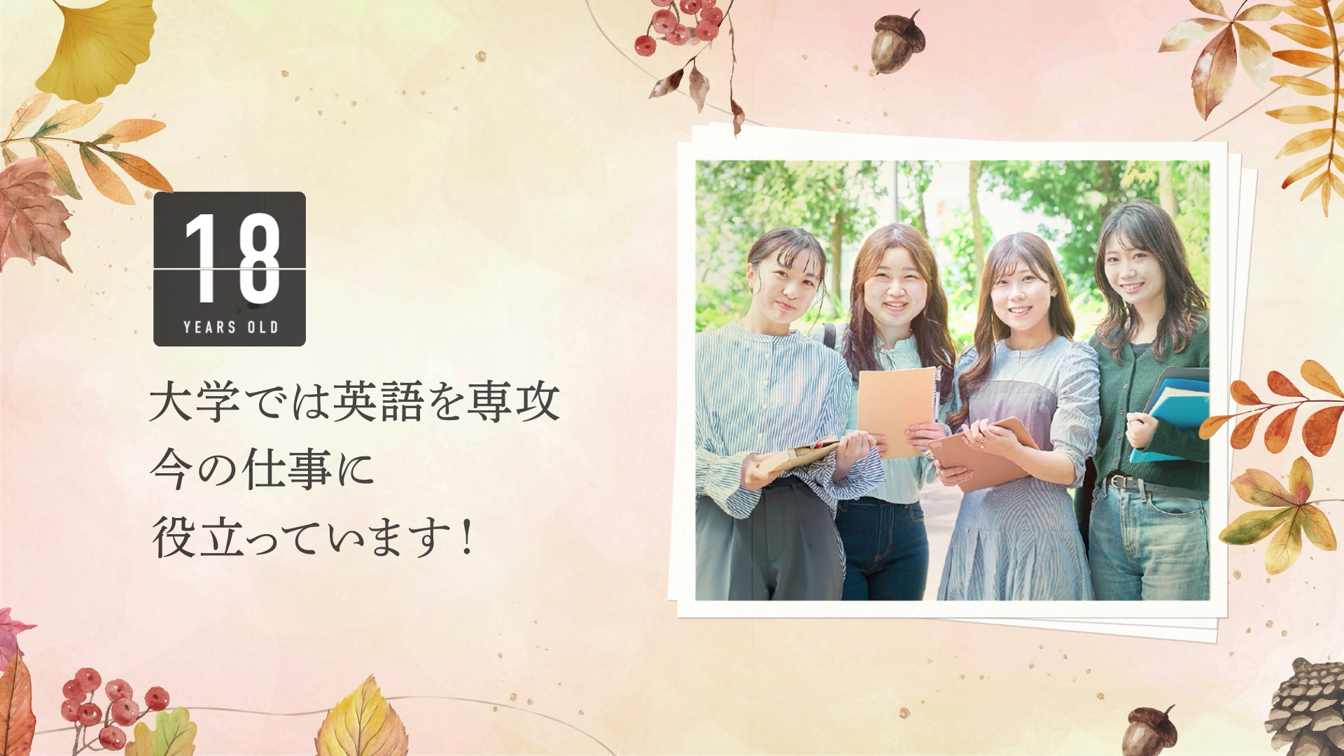 おふたりの誕生から出会い、プロポーズまでをあたたかくやさしい印象で紹介してくれるプロフィールムービー。 ゆらゆらと揺れる紅葉とともにおふたりの生い立ちをたどりながら、感謝の気持ちをしっかりと伝えることができます。ご両親やゲストの皆さまの心をほっこりとさせる、アットホームな雰囲気の結婚式にしたい方におすすめです!