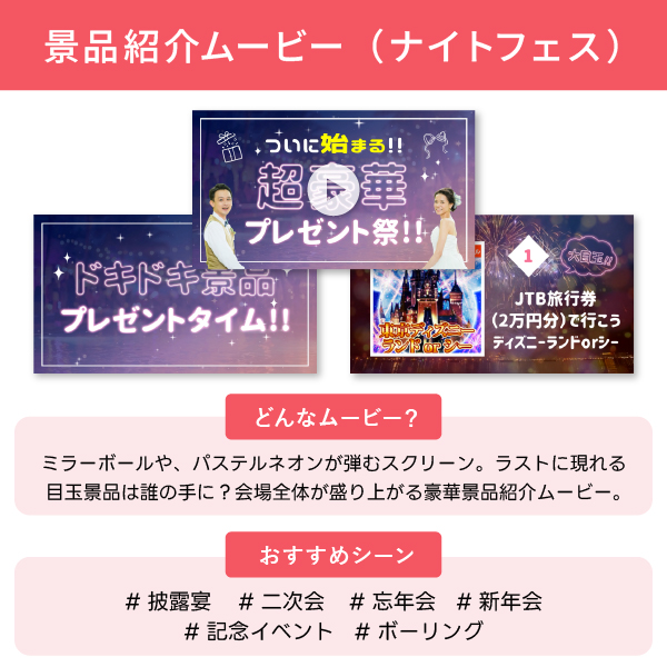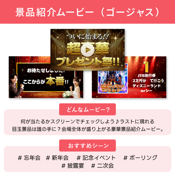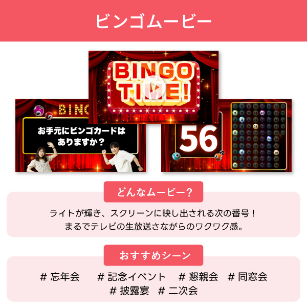 テンプレートには、披露宴や二次会、忘年会、イベントで盛り上がる演出が豊富に揃っています。