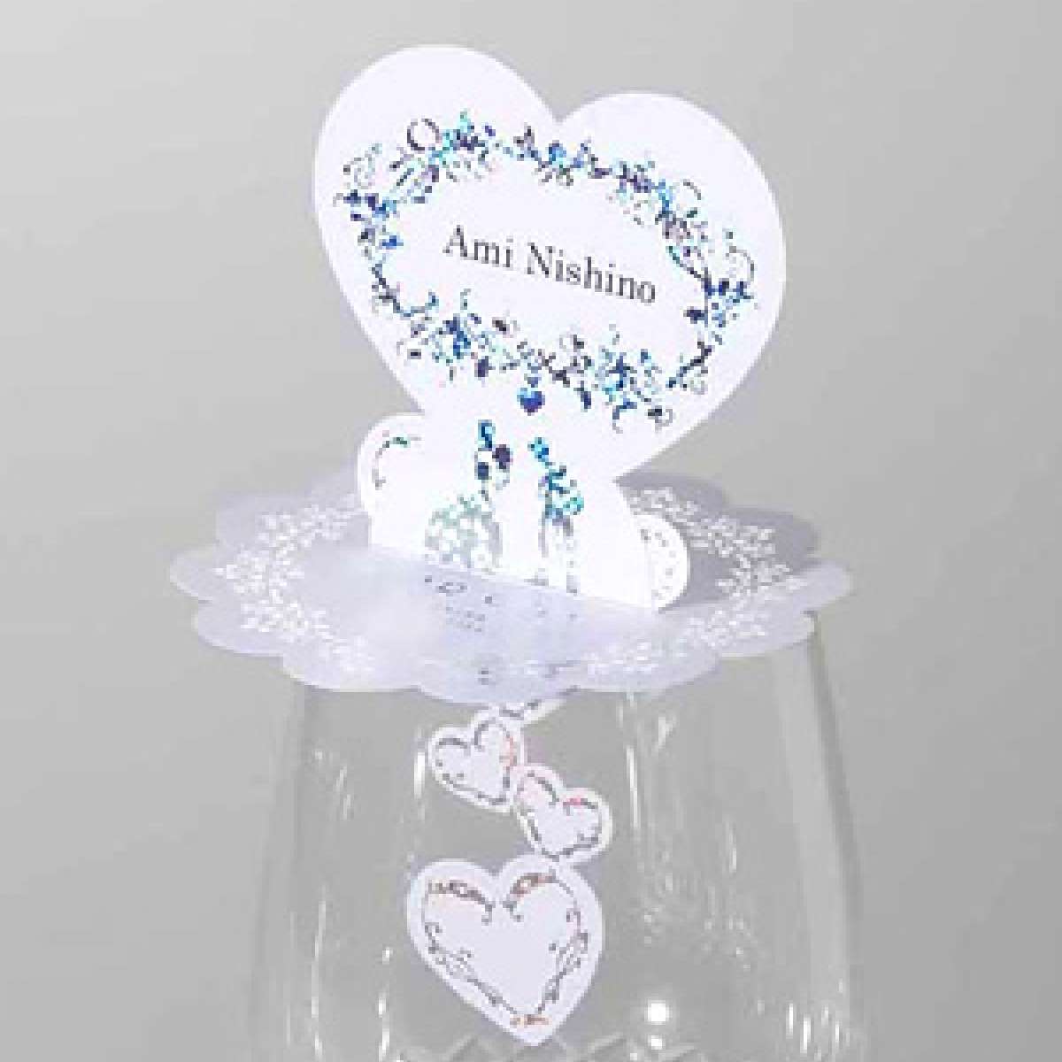 かわいいです! 真っ白で会場のグラスに置くのが楽しみです。 ただ、ゲスト一人一人にメッセージも書きたかったのですが、ハートの裏だと透けてしまうので、気をつけたほうがいいです。