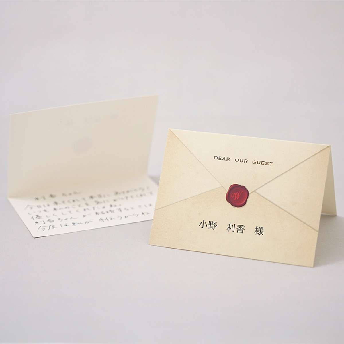 お手紙のようなデザインでとても可愛い席札でした! 実際に席札の裏面に直筆のメッセージを書いたのですが、デザインと合わせて本当のお手紙のようでとっても可愛かったです。
